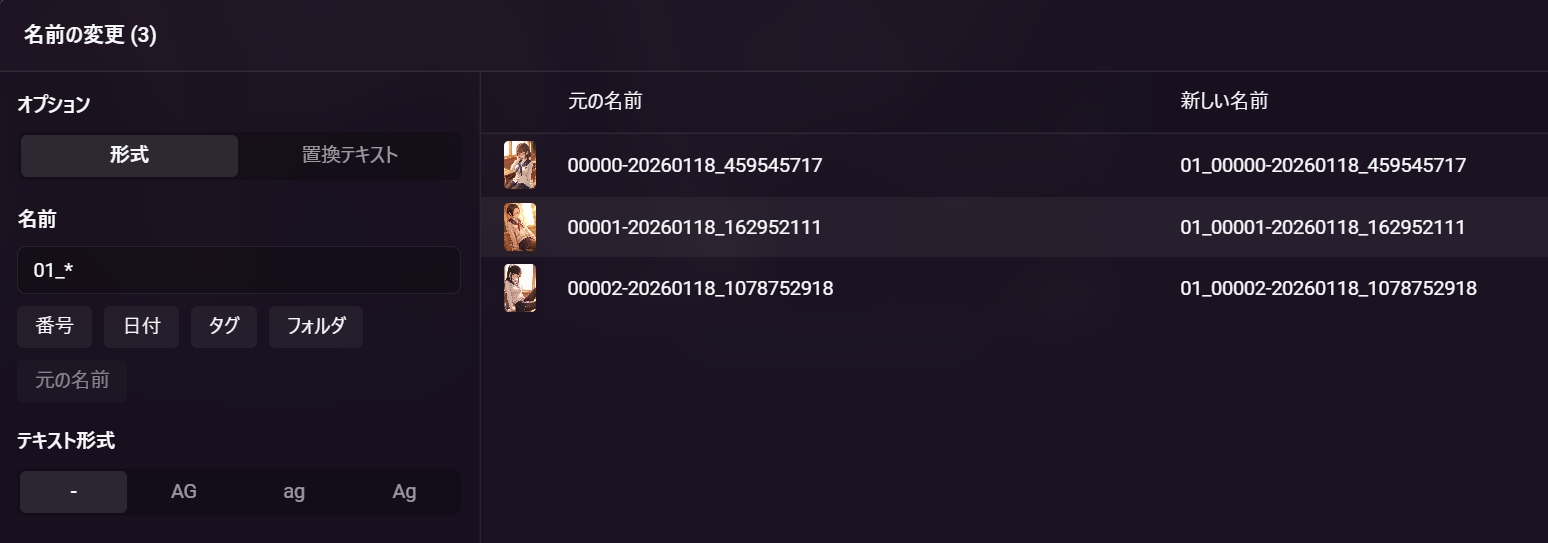 ここでフォルダ名(画像だと01_)「01_*」を元ファイル名の先頭につける形にしてリネームすると、あとから一つのフォルダに移動しても、名前順にソートすればフォルダ順に画像が並ぶ形となります。