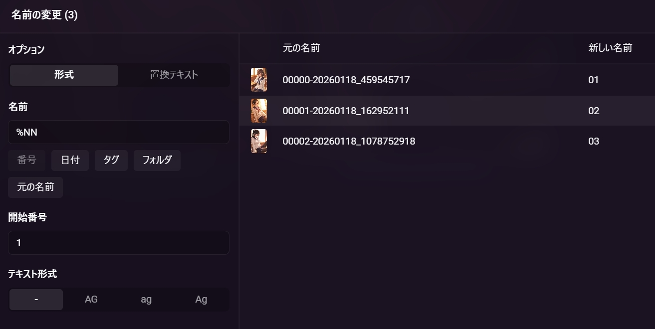 ここで全画像を選択して名前の変更を出して、今度は「%NN」と番号を設定(この場合は2桁)すれば、綺麗な連番にできます。