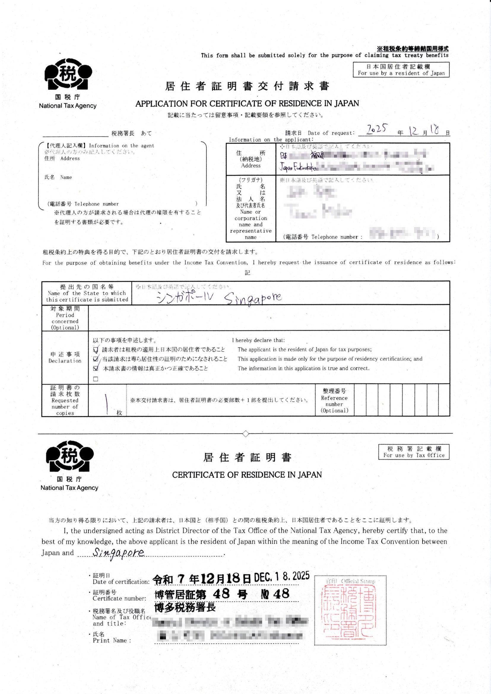 今回の場合、居住者証明書が必要になります。ChatGPTからは住民票が必要と言われましたが、たぶんそれは間違いだと思います(住民票でOKだったという例をググっても全く見つけられませんでした)。