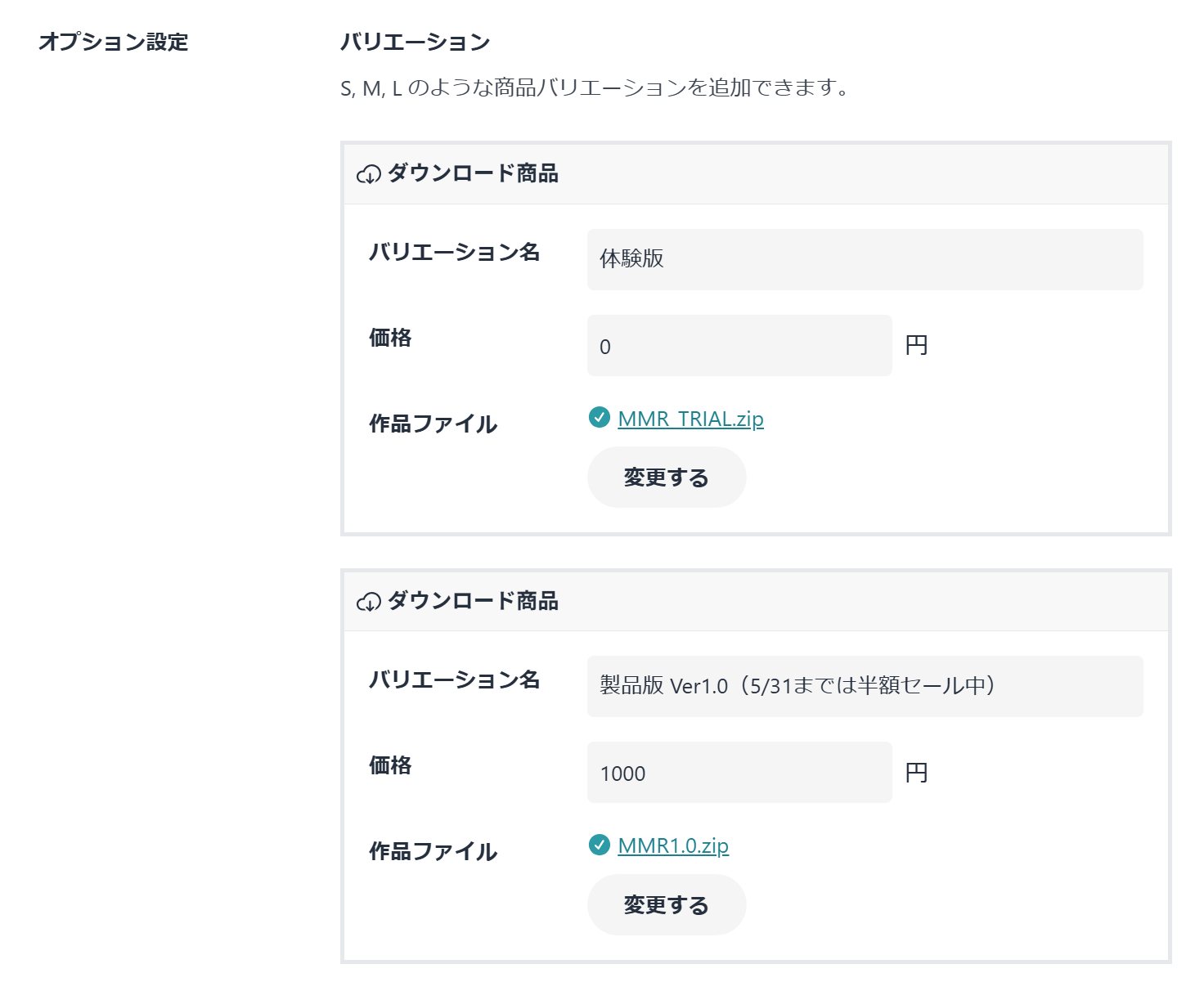 バリエーションが選べるので、それぞれにファイルを選択して値段設定するとよいです。