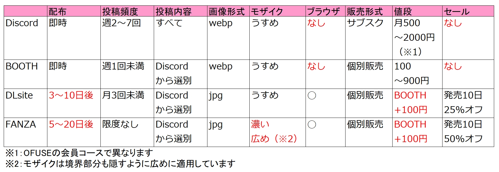 Discord(OFUSE)だけは月額サブスク、それ以外は個別販売です。