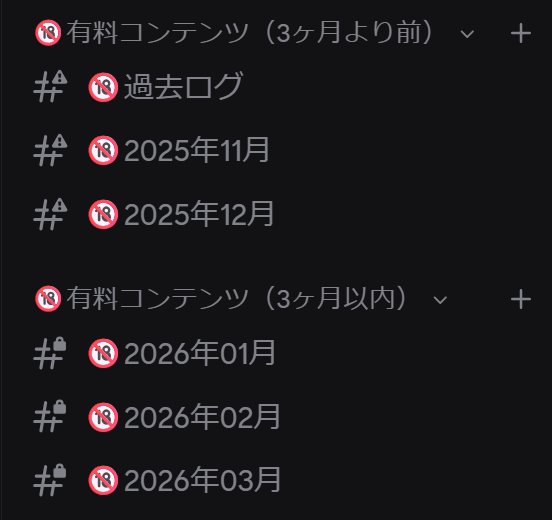チャンネルについては年月ごとに用意することで、メンバーシップで2ヶ月前まで閲覧可能みたいな運用を楽にできるようにしてます。Patreonだと記事を一つずつ適用ロールを変えないといけないので投稿数が多いと毎月の作業が大変ですが、Discordで年月ごとにチャンネルを用意すれば、3ヶ月前のチャンネルだけ閲覧可能ロールを変更するだけで事足ります。